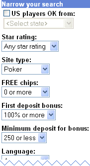 ![]() Scroll down to see all of the choices that are available to you. They are: US player policy, Star rating, Site type, FREE chips, First deposit bonus, Minimum deposit for bonus, Language, Currency, Certifications, Site software. |